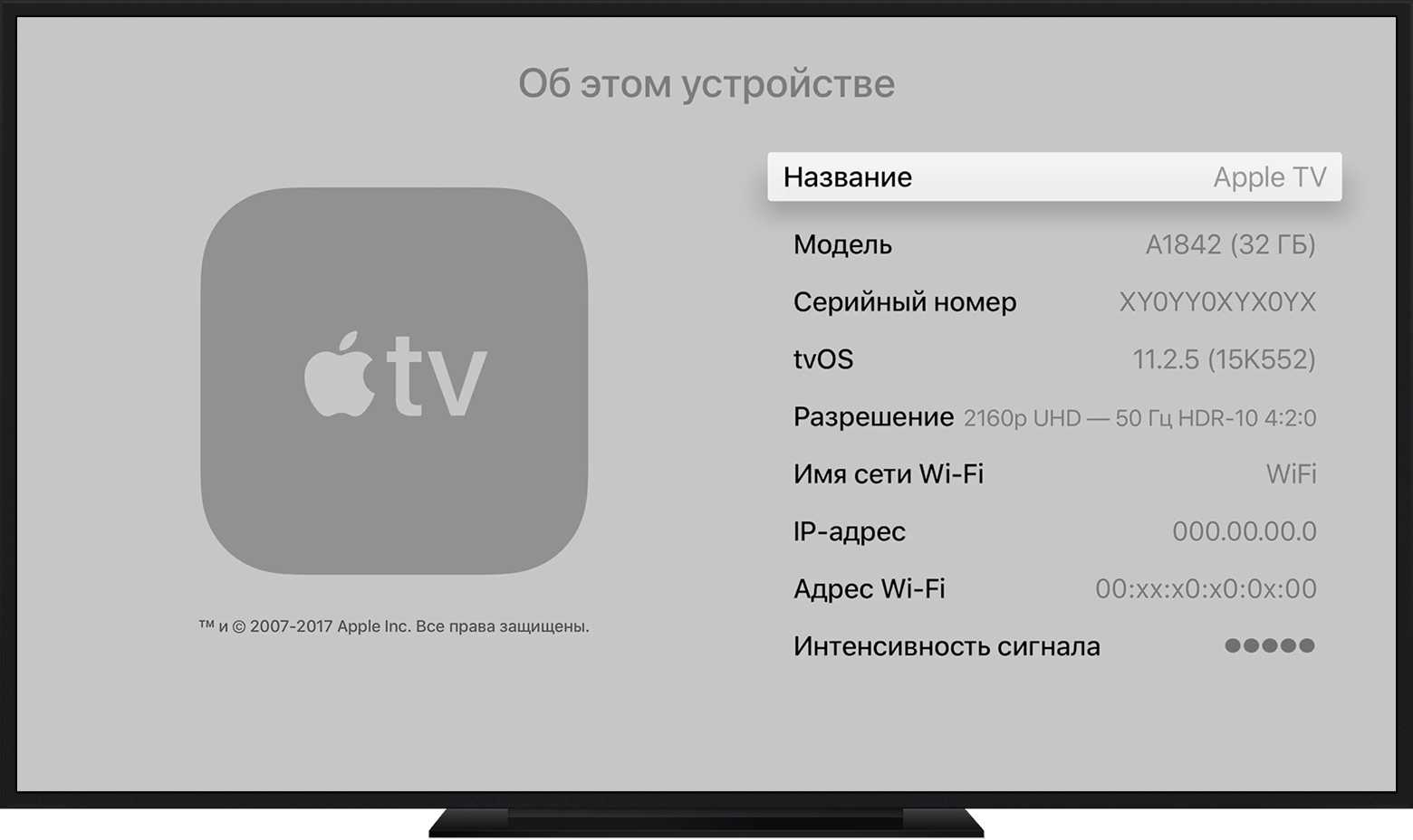 На экране «Домой» Apple TV перейдите в раздел «Настройки» > «Основные» > «Об Apple TV» и проверьте пункт «Модель».