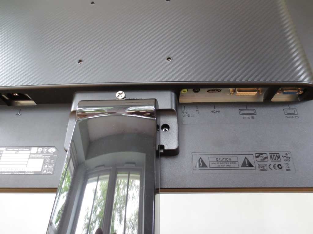 The ports are downward facing, which allows you to wall mount the monitor with minimal wall clearance. There is an AC power input to the left of the stand with the remaining ports to the right; line-in, headphone jack, HDMI, DVI-D and VGA.