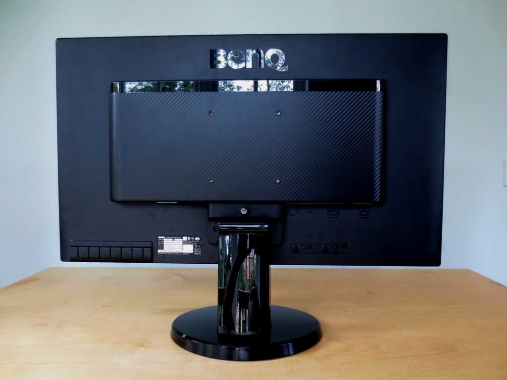 At the rear you can see some VESA holes surrounded by a zig-zag patterned matte plastic. There is a glossy black plastic strip and BenQ logo above this. There are some simple 1W stereo speakers which provide basic and fairly low quality sound output. These face upwards beneath the manufacturer logo. Aside from the logo, plastic strip and the glossy plastic stand everything else is plain matte black plastic. At the bottom left you will find the buttons and at the bottom right a Kensington lock socket. In the middle you’ll find the stand neck and quick release button to detach the stand.