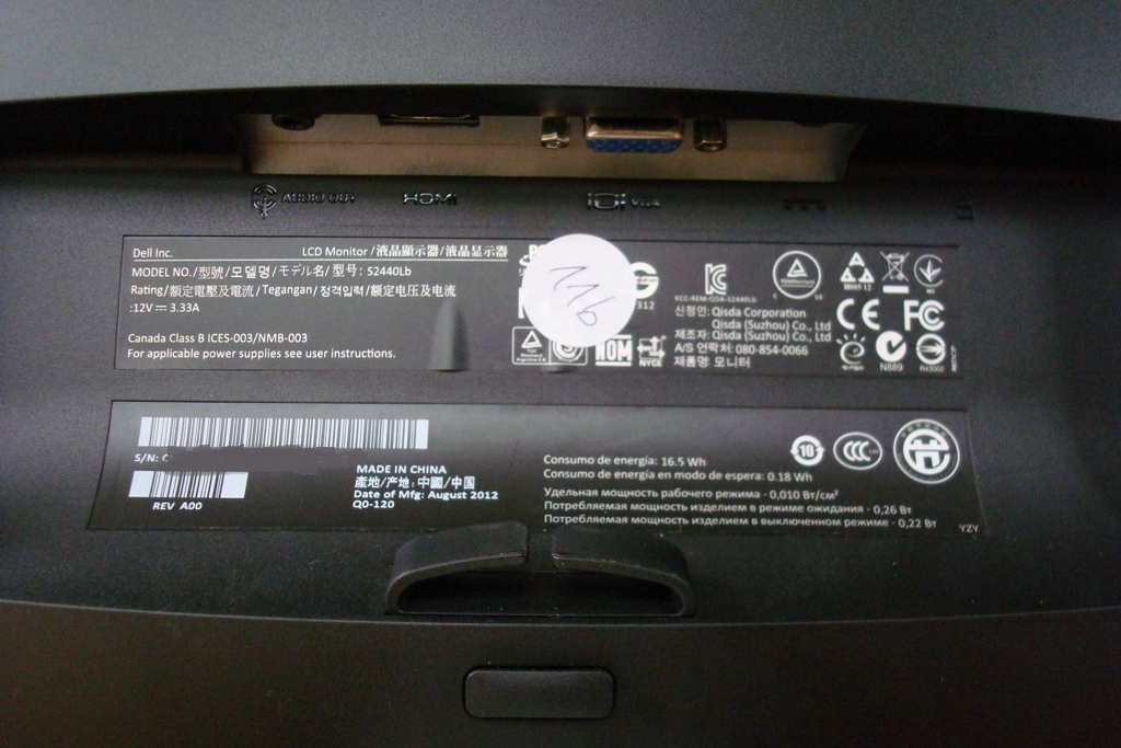 Just above the stand there is a release button, cable-tidy, information label and of course the ports (facing downwards as shown below). Although the stand is detachable there are no VESA holes on this model to allow convenient alternative mounting – another reason for its relatively slender profile.