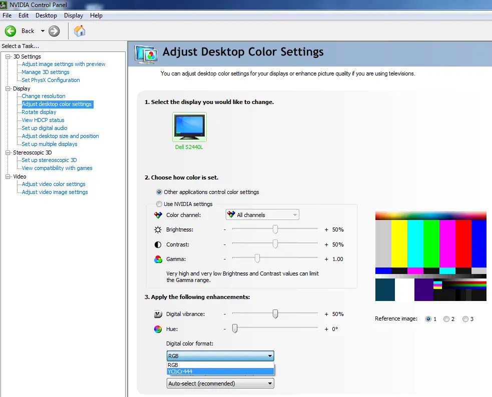 Interestingly Nvidia GPUs respond very differently. They use ‘RGB’ by default over HDMI but it seems to be quite a messed up signal for Nvidia cards on the S2440L. The low-end shades become crushed and, most significantly, black is displayed as a murky grey – yielding an abysmal contrast ratio of around 300:1 under default settings. This can be resolved by navigating to ‘NVIDIA Control Panel –> Adjust desktop color settings –> Digital color format’ and selecting ‘YCbCr444’ as shown below.
