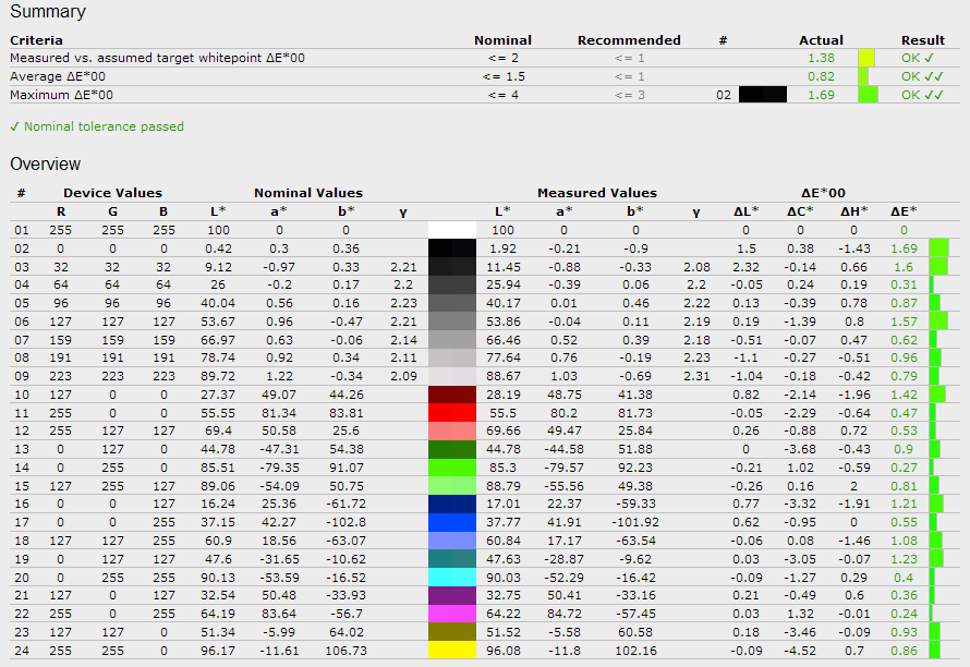 Точность цветопередачи до калибровки была вполне приемлемая, невооруженным глазом заметить какие-то проблемы было нельзя — по результатам измерений среднее значение отклонения delta E составило 2.54 (напомним, считается, что человеческий глаз неспособен заметить разницу, если этот параметр не превышает 3). После калибровки, разумеется, ситуация значительно улучшилась: