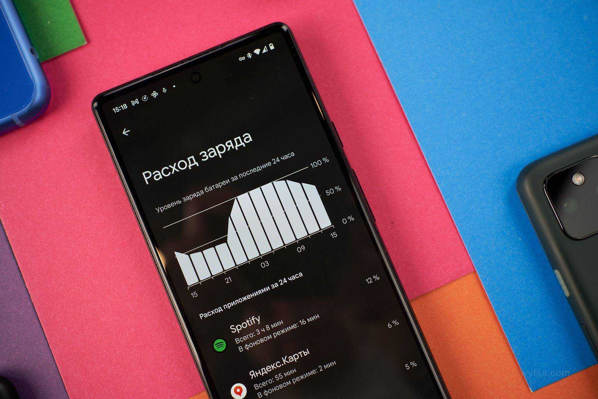 У меня в среднем получалось около шести часов активного экрана в день. Результат не рекордный, но и не ужасный — к примеру, Pixel 5a у меня живёт около 7-7,5 часов.