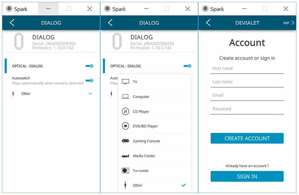 Finally, the Options tab gives access to information about the application and the user’s account, but also to the settings. Here you can enable/disable each source, select the quality of the streamed files (for example, for Qobuz: Hi-Res, Flac or MP3) and configure each device (speaker name, optical input and/or Bluetooth activation, UPnP compatibility beta test for Dialog, source selection, connection indication).