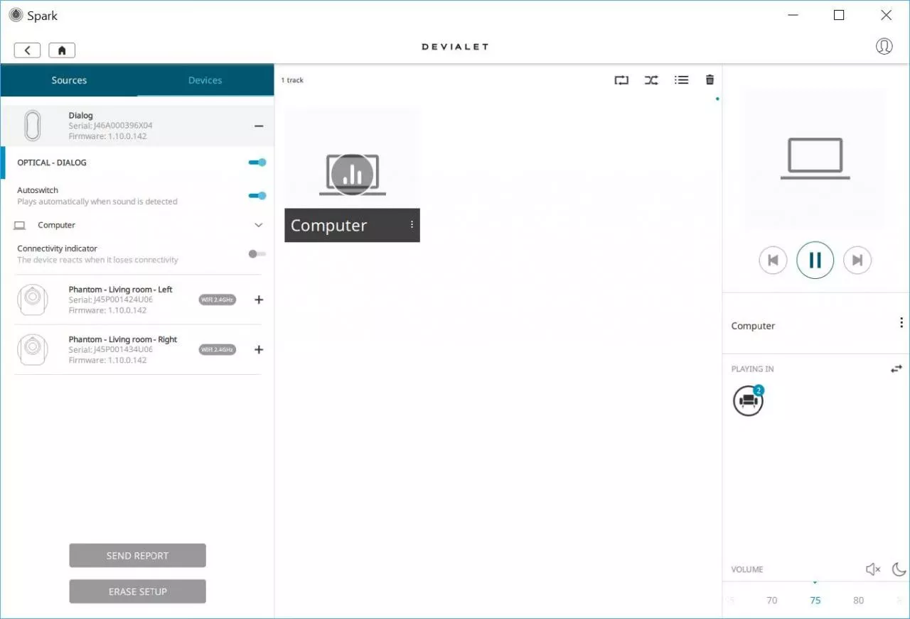 The creation of groups is just as fluid as the configuration of the speakers themselves: the speaker concerned emits a crystalline sound when you grab the corresponding icon on the application, which you then simply drag to the chosen position (above, left stereo, right stereo or mono) to assign it the appropriate channel. Unfortunately, these groups cannot be modified “live“: if you want to switch from a pair of stereo speakers to a double mono (to sound two different rooms, for example), you will have to reset the speakers, then configure them again. Future updates promise to solve this problem as well as the problem of not supporting multi-channel, which is something to follow.
