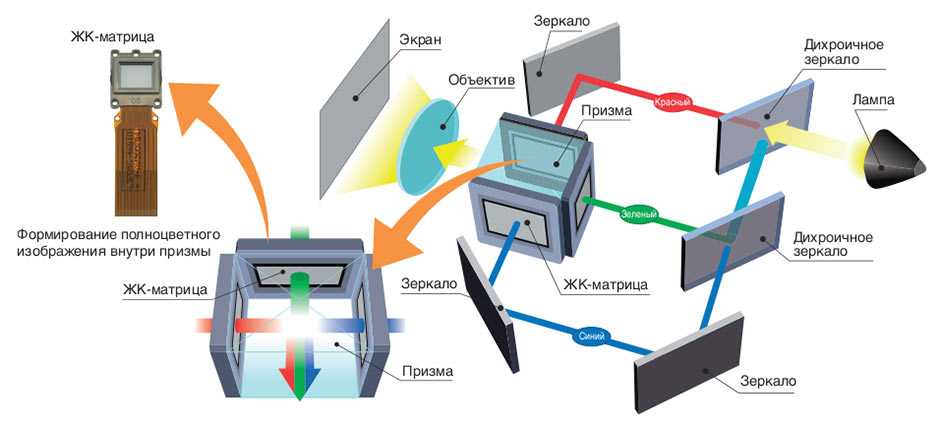 Сами по себе матрицы, установленные в ЖК-проекторе — монохромные (т.е. формируют черно-белое изображение). ЖК-матрицы могут закрываться и открываться, тем самым пропуская либо не пропуская свет (либо пропуская его частично). Поскольку на каждую матрицу подается цветной пучок света, то на выходе получается черно-красное, черно-зеленое и черно-синее изображение. Они объединяются в полноцветное изображение в призме, на которой установлены все три матрицы, после чего результирующее изображение передается далее в оптическую систему и объектив и в итоге попадает на экран.