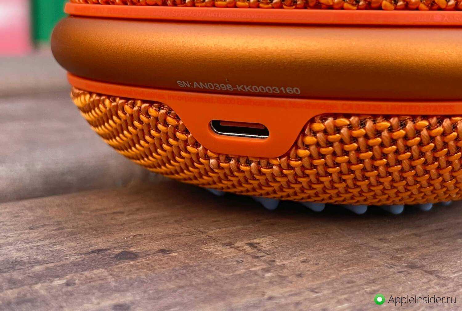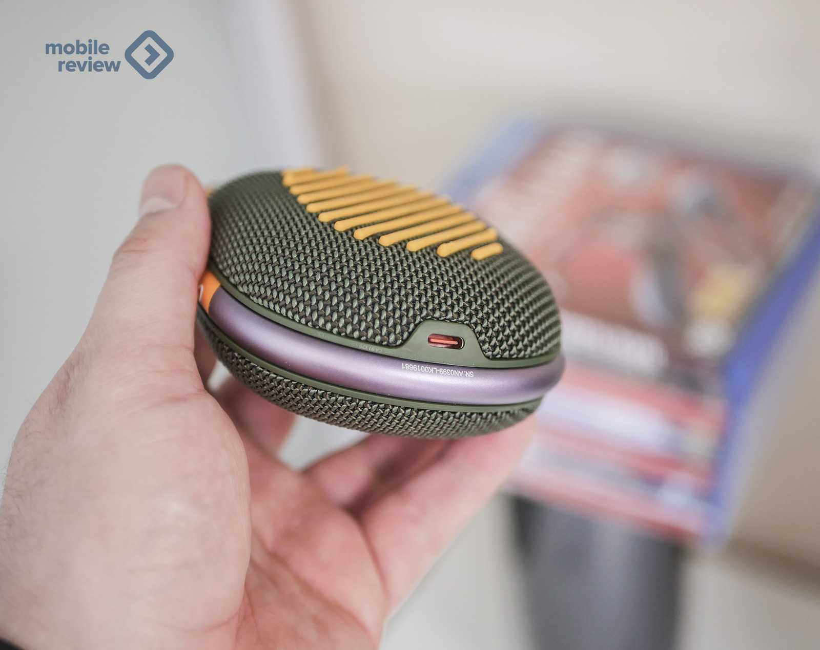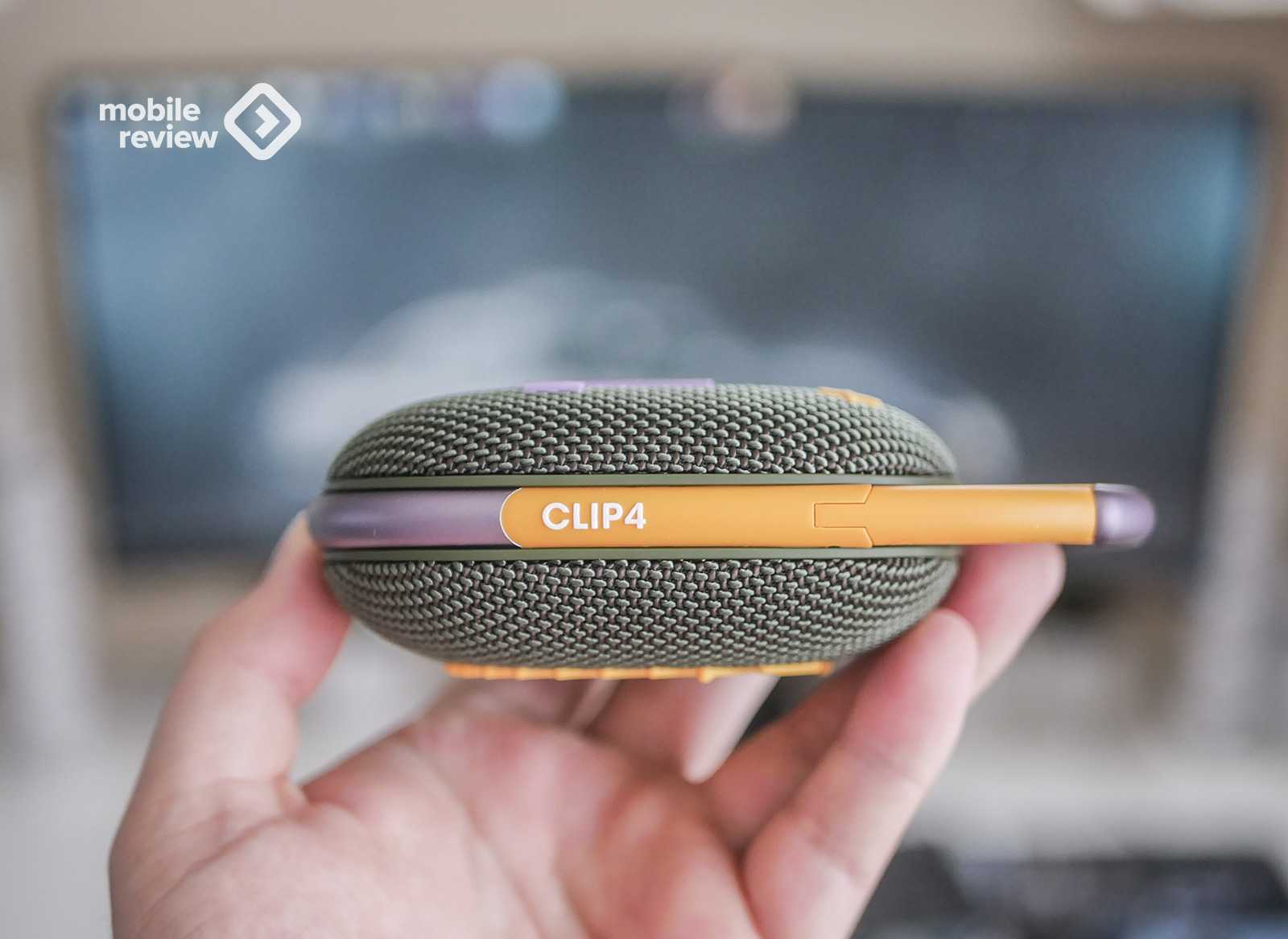 Надпись JBL выполнена из резины фиолетового цвета, кнопки – из пластика желтого цвета, левая часть карабина – фиолетовый металл (я до конца не понял, что это за материал), а правая – желтый пластик, покрытый слоем резины. С обратной стороны присутствуют «реечки» из резины желтого цвета. Надпись CLIP4 объемная, резиновая, белого цвета. А разъем USB-C внутри красного цвета. Короче говоря, дизайнеры бренда JBL заморочились не на шутку! Мне кажется, что отсюда и стоимость в 4 000 рублей.