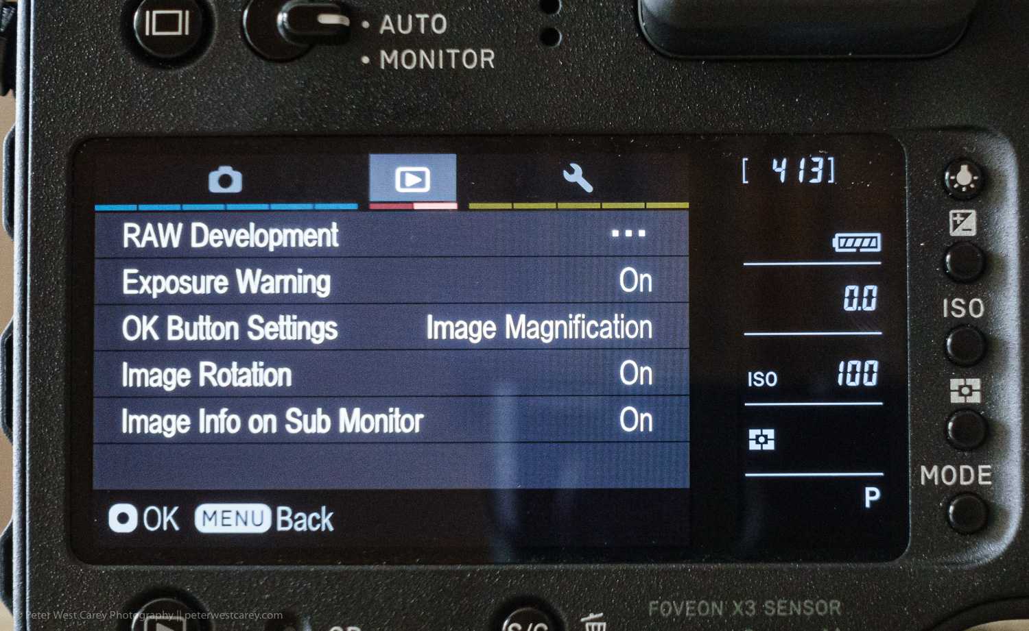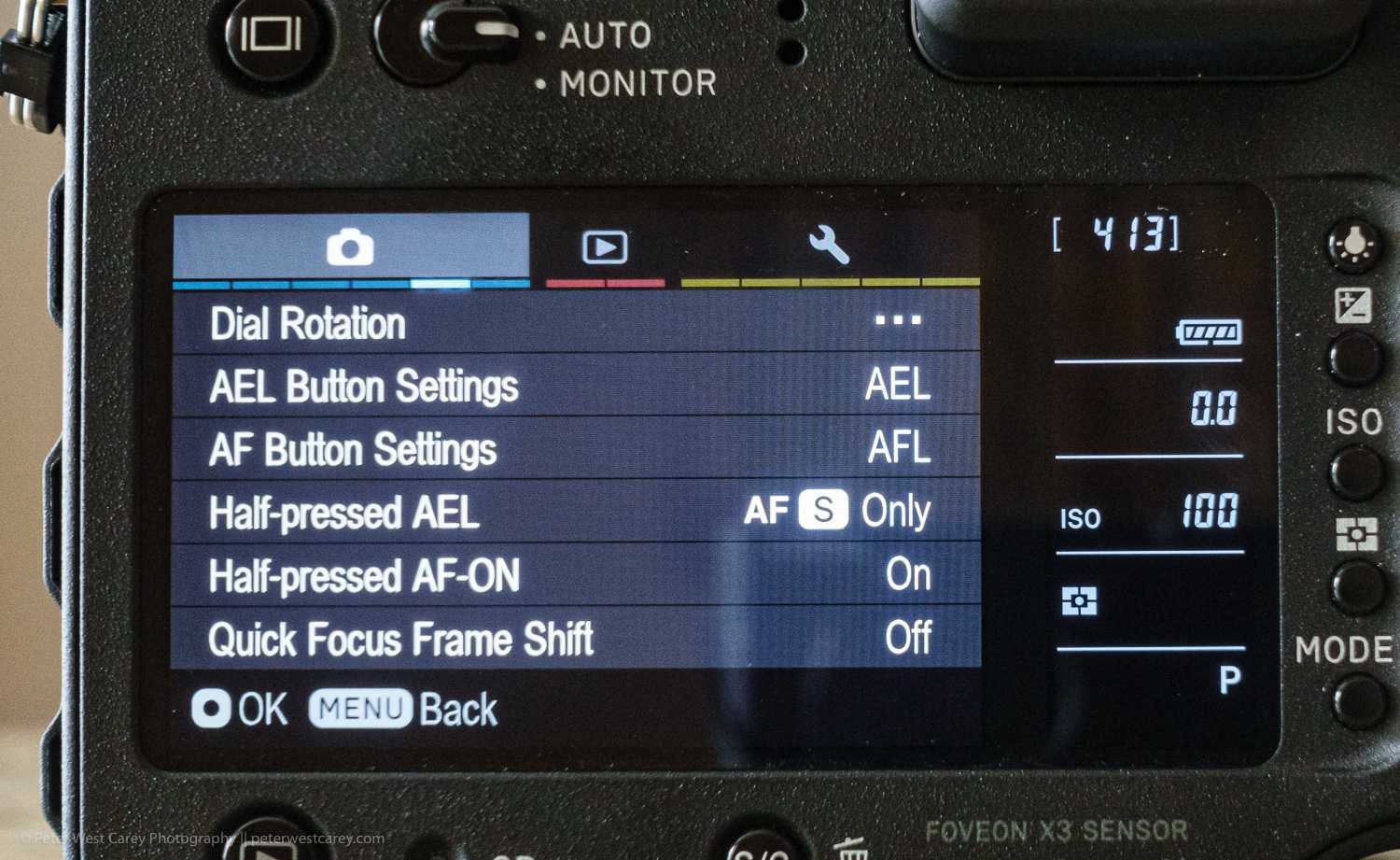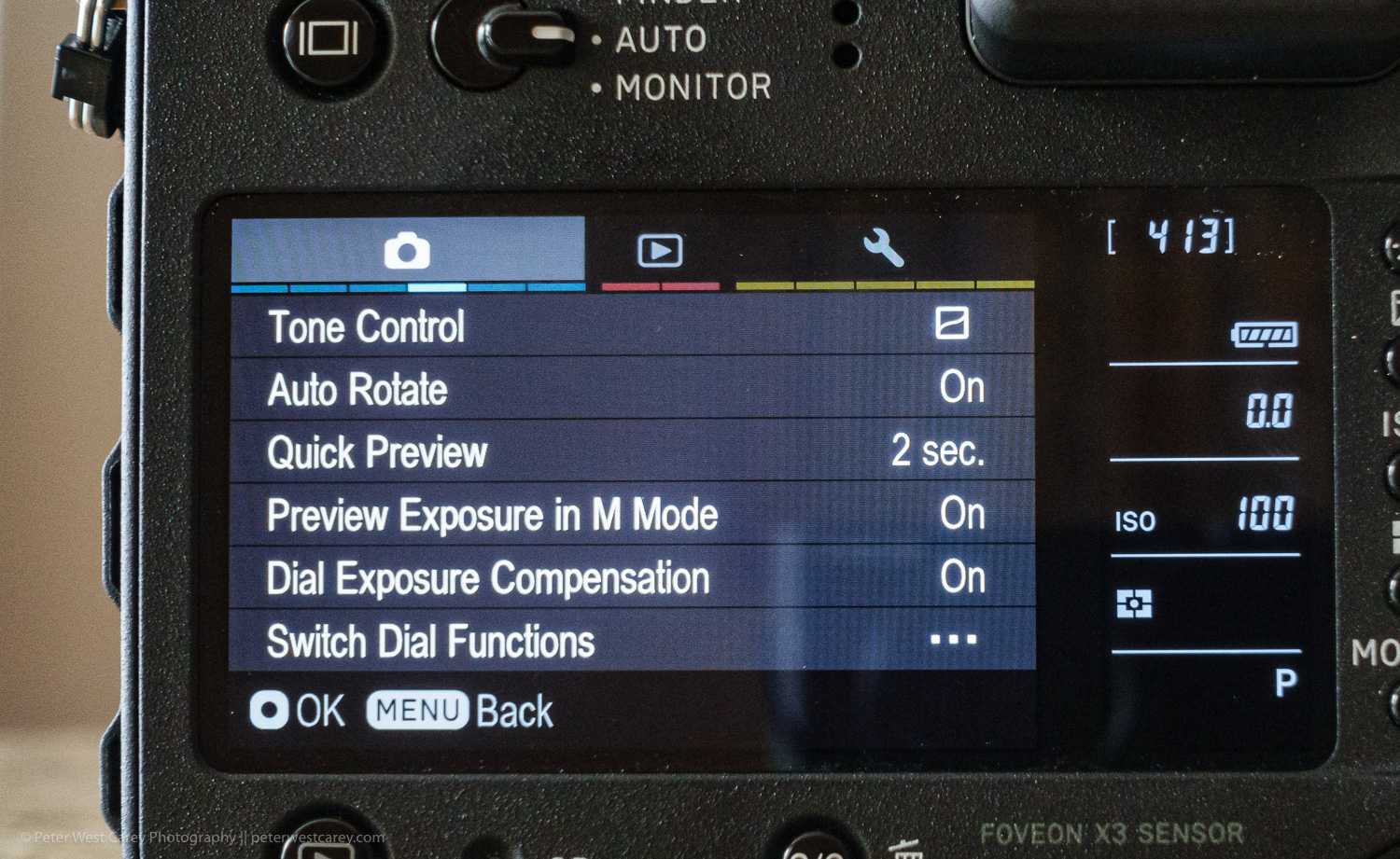 Before we get into the menus, the Quattro has a hand QS button on the top, just next to the shutter release. It brings up a Quick Selection menu (either in the viewfinder or back screen). This is where you’ll want to make most of your image quality and other changes. The menu options are selectable within the camera’s options menu.