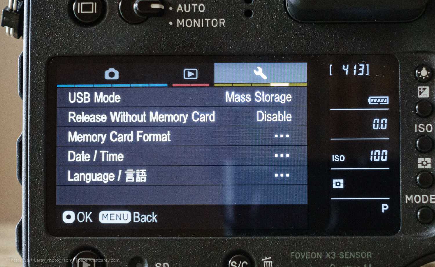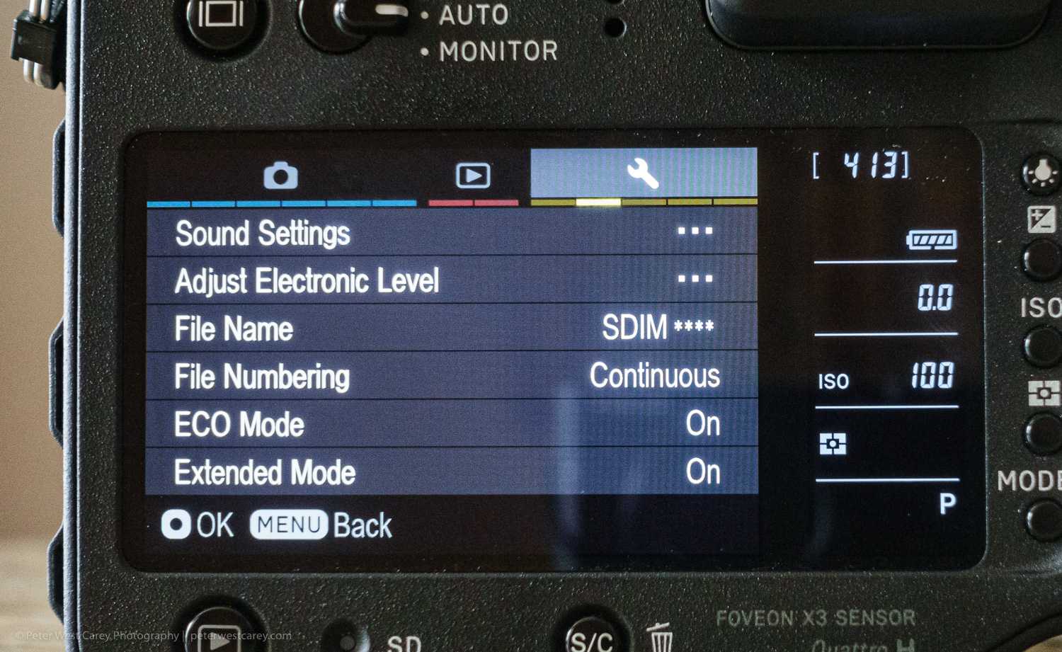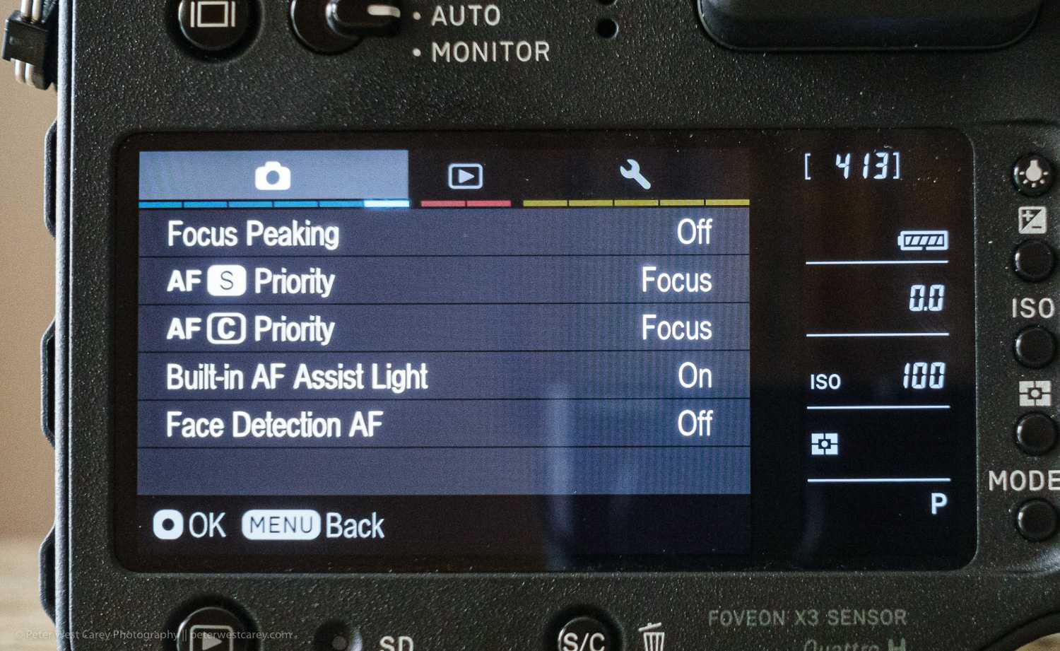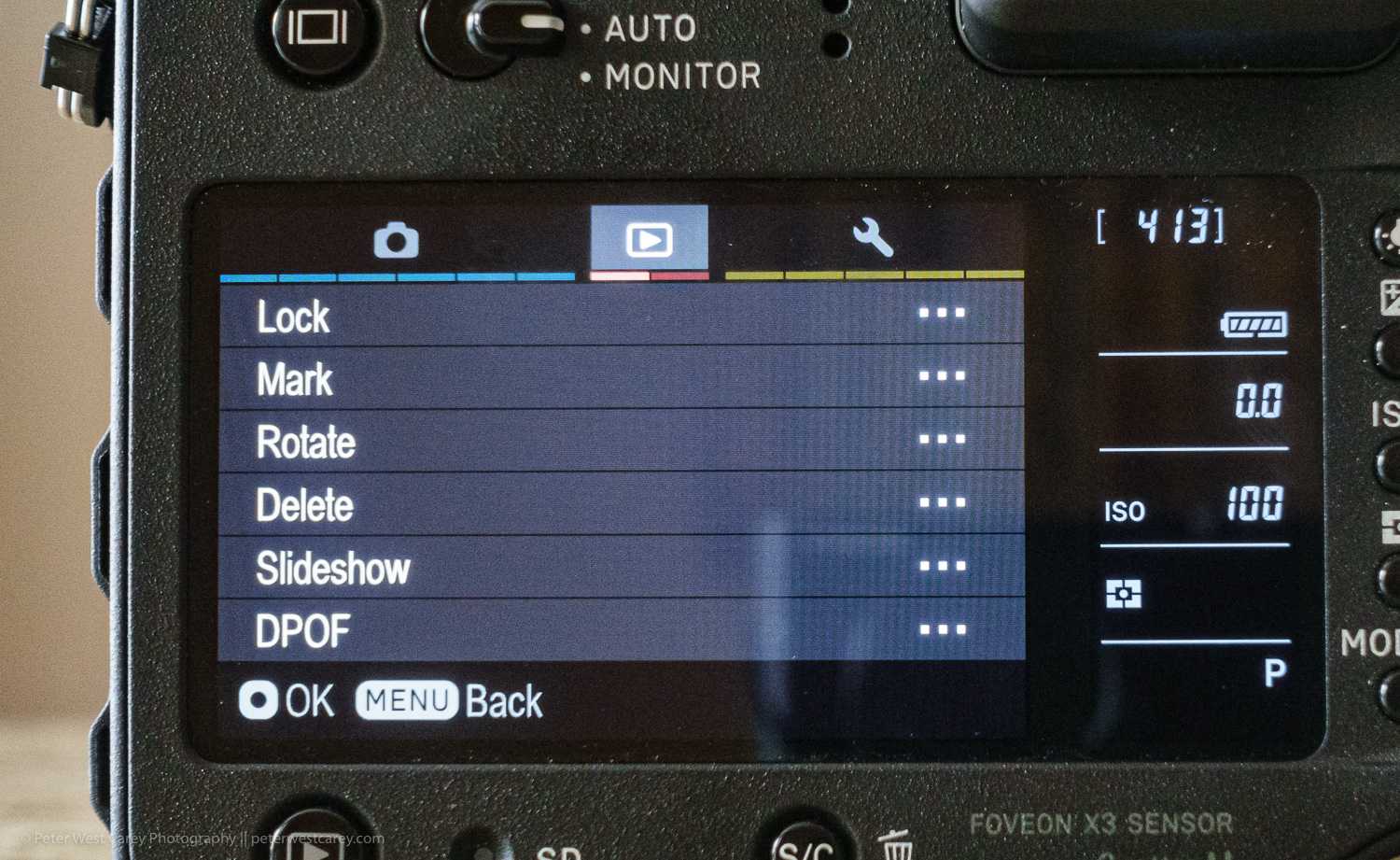 Before we get into the menus, the Quattro has a hand QS button on the top, just next to the shutter release. It brings up a Quick Selection menu (either in the viewfinder or back screen). This is where you’ll want to make most of your image quality and other changes. The menu options are selectable within the camera’s options menu.