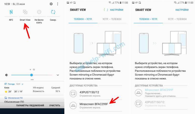 В зависимости от версии Android, от производителя телефона/планшета, от оболочки – функция Miracast может называться по-разному. «Беспроводной дисплей», «Smart View», просто «Miracast». Ищите пункт в меню, кнопку в настройках или в центре управления. На моем Samsung это функция Smart View.