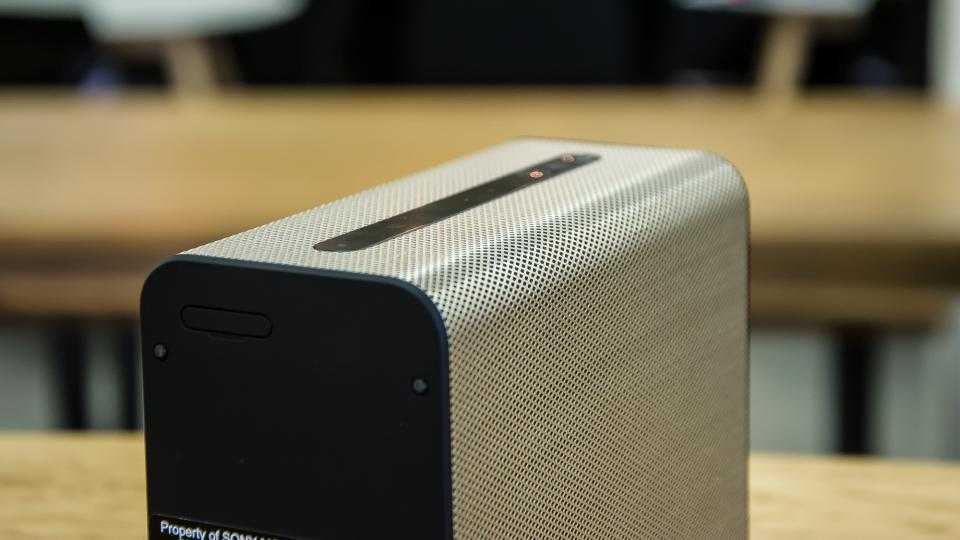 Xperia Touch не похож на ваш стандартный проектор. Большая часть его корпуса обернута в золотую решетку динамика с гладкой стеклянной передней панелью, в которой находится проектор. Задняя часть выполнена из эластичного прорезиненного пластика и имеет слот для карт памяти microSD. Пластиковую панель в нижней части можно снять, чтобы упростить доступ к порту USB-C, который обеспечивает питание 15 В с помощью прилагаемого адаптера, и вход micro HDMI для подключения к источникам данных или видео. Решетка в верхней части проектора отмечена черной полосой, на которой расположены кнопка питания, микрофон, пара светодиодных индикаторов и сенсорная панель для регулировки громкости.