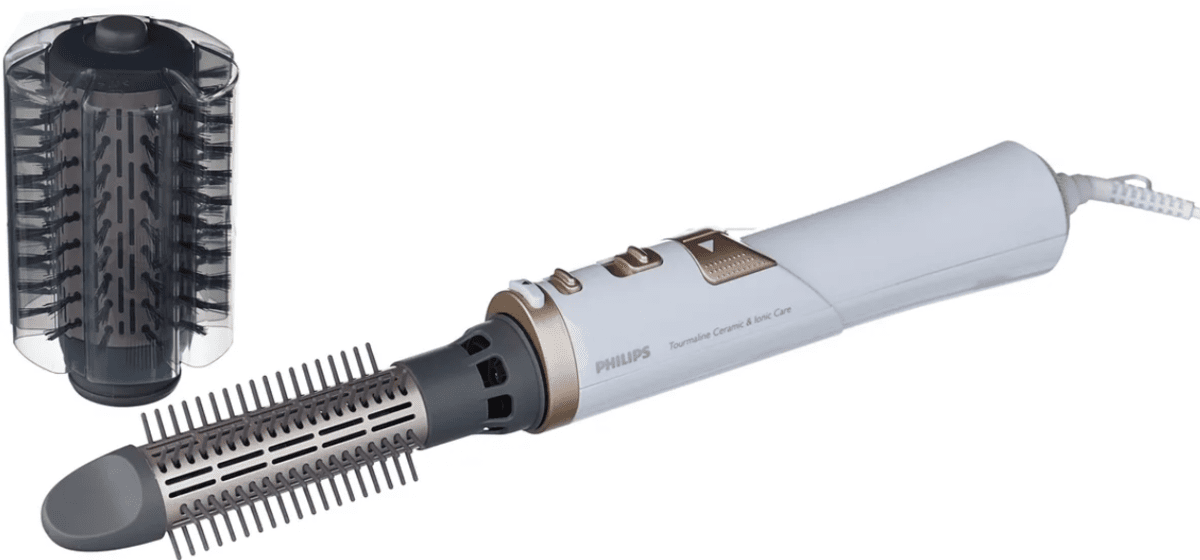 Эта фен-щетка отличается долговечностью, многие пользователи говорят, что пользуются ею более 5 лет. Прибор имеет высокую мощность, но при необходимости может быть переключен в щадящий режим, поэтому пряди не будут пересушены. В комплекте идет пять различных насадок с покрытием из керамики, есть ионизация. Дополнительный комфорт обеспечивается тем, что щетина и зубцы могут убираться внутрь. Эта же функция продлевает срок эксплуатации насадок.