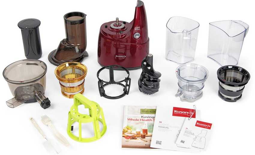 - Комплектация. К основным контейнерам могут прилагаться фильтры для получения сорбетов и пюре, насадки с функциями блендера или терки, толкатель для безопасной загрузки ингредиентов через горловину и специальные щетки для чистки.