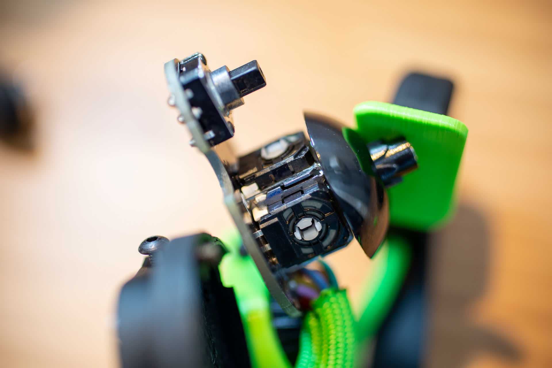 Внутри каждой башни я обнаружил четыре свитча плунжерного типа D2F-01 от японской компании Omron. Сверху расположен тактильный свитч B3F от той же фирмы. Это надежные свитчи известного бренда, благодаря этому их легко найти даже в местных магазинах (это к вопросу о постгарантийной ремонтопригодности).