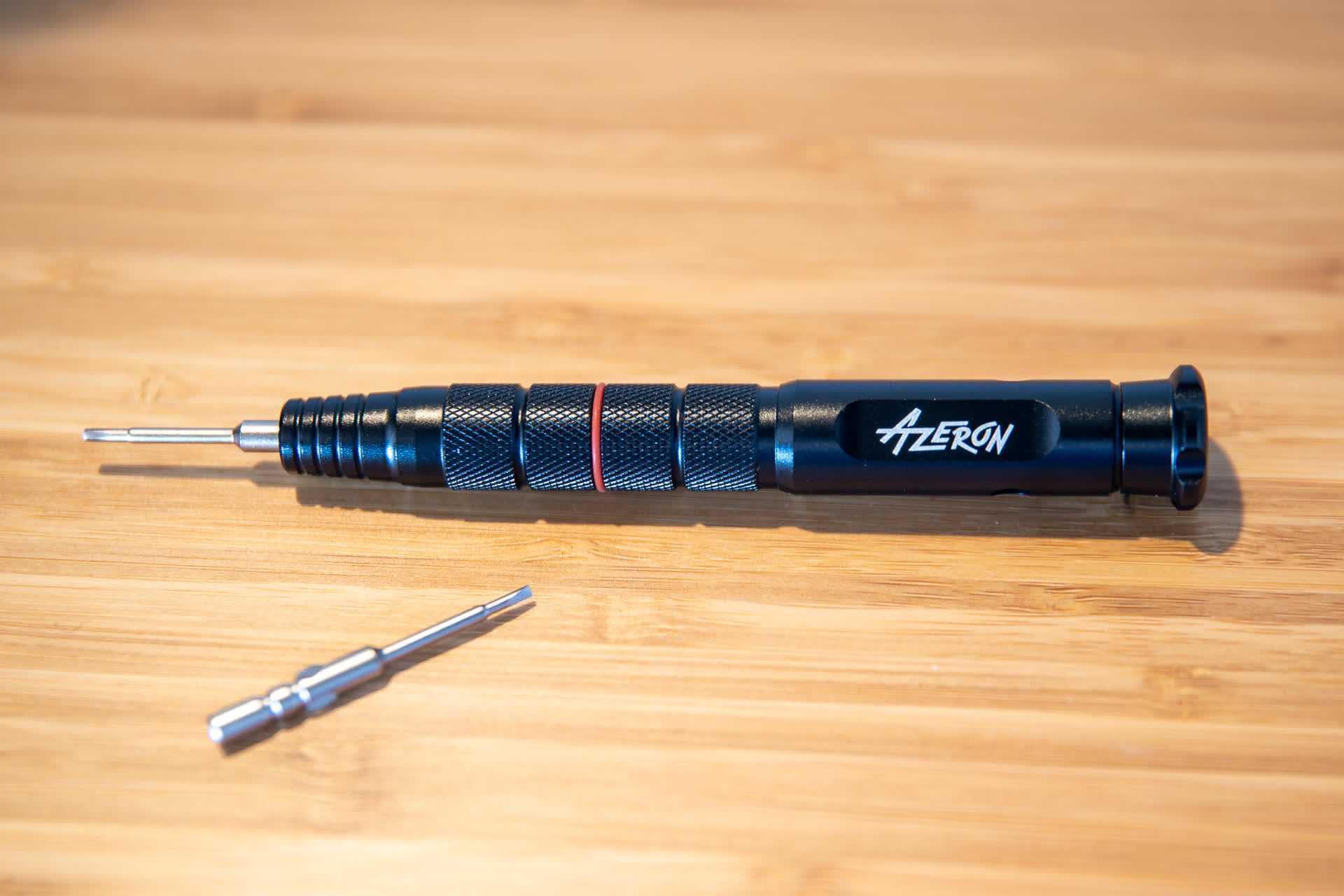 Следующим пунктом идет увесистая отвертка с двумя намагниченными битами: H1.5 шестигранником и SL 1.5 (он же “минус”). Корпус отвертки сделан из алюминия. На ее конце, как и положено мелким отверткам, есть вращающийся упор, но… там вроде бы стоит подшипник, потому что отвертка так легко (и долго) вращается. Я даже поймал себя на том, что сижу и кручу ее, как спиннер! Очень приятная на ощупь и вес, качественное изделие.