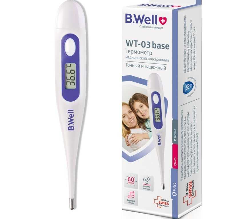 Измеритель произведен швейцарской фирмой медтехники B.Well. В рейтинге цифровых термометров модель WT-03 получила ведущее место. Это связано с высокой надежностью устройства, и другими положительными характеристиками. К ним относятся: