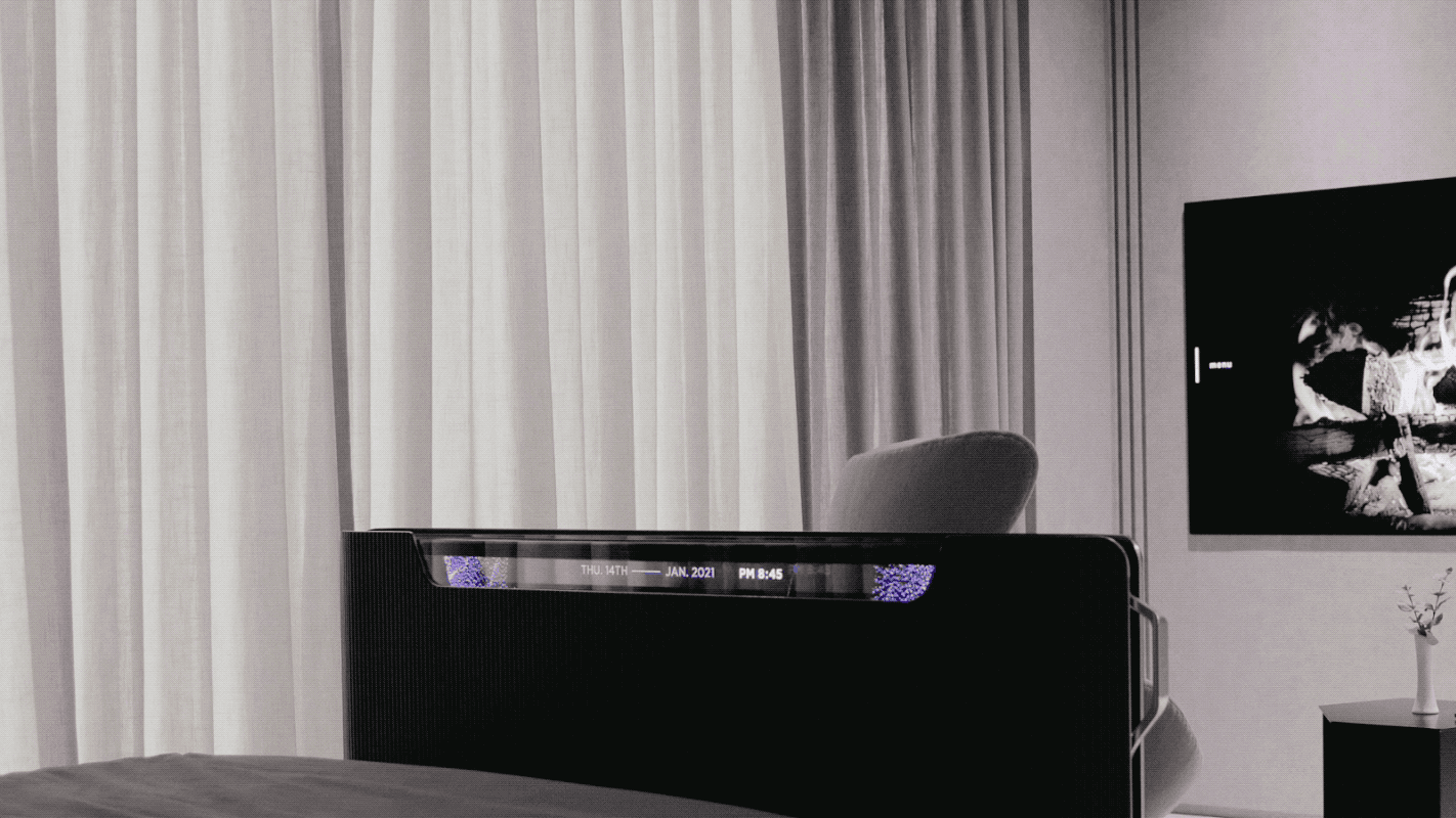 LG Display предложила установить в спальне в изножье кровати 55-дюймовый прозрачный телевизор OLED Smart Bed. Фактически это все тот же прошлогодний телевизор-рулон, но с прозрачной матрицей.