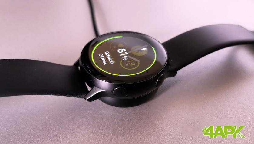 Samsung Galaxy Watch Active заряжаются от беспроводного ЗУ. Оно создано в виде маленького диска с магнитом и несъёмным кабелем. Используется стандарт Qi, так что в теории их можно заряжать и от сторонних зарядок. Или от мобильных гаджетов линейки S10, разумеется.