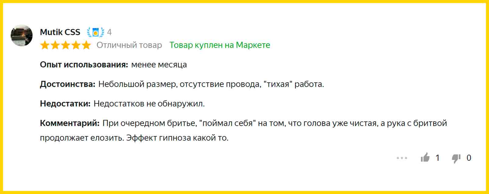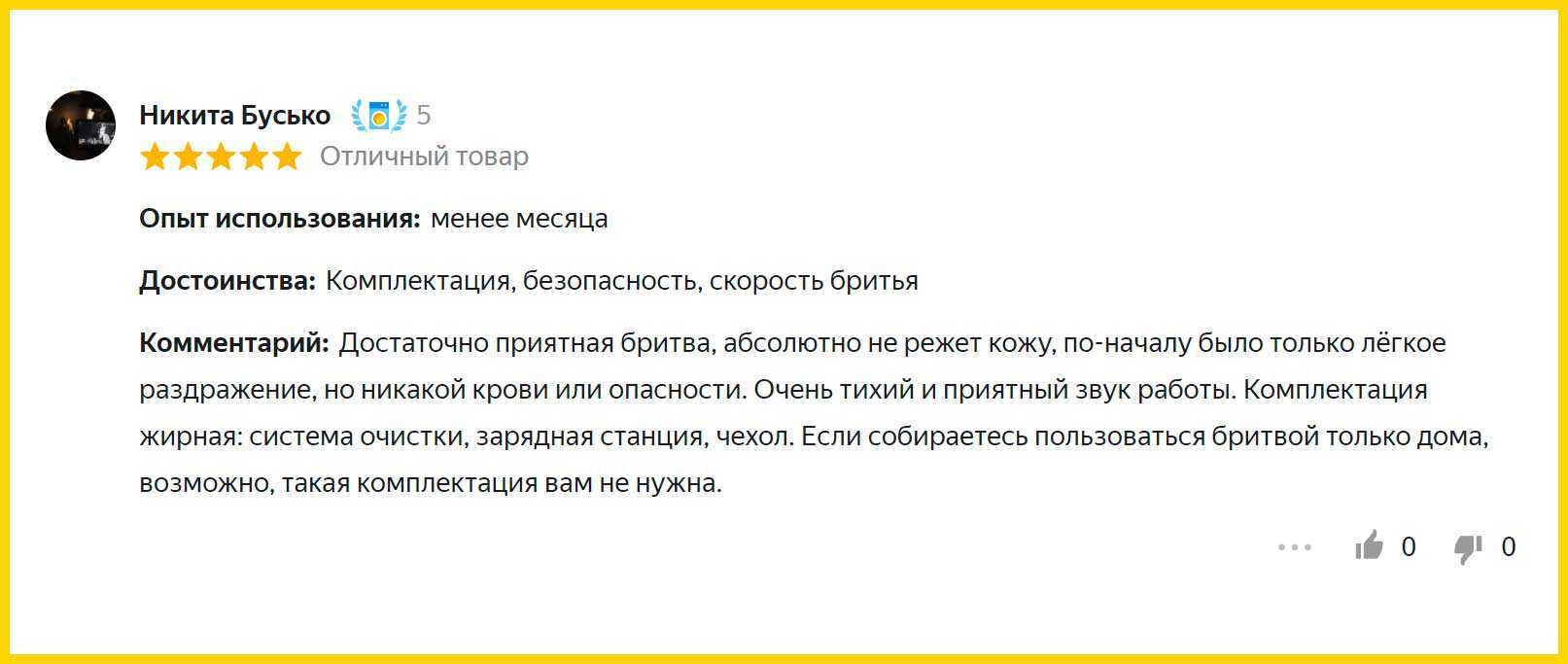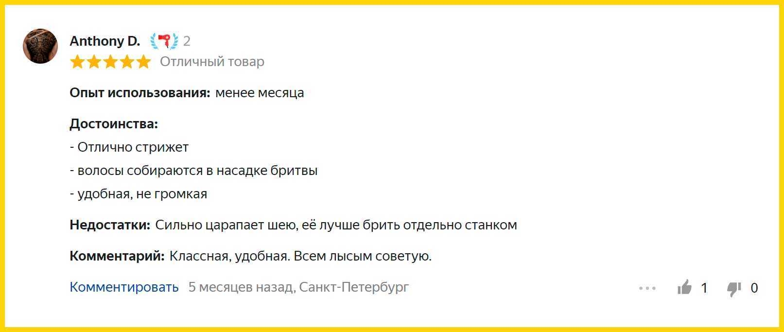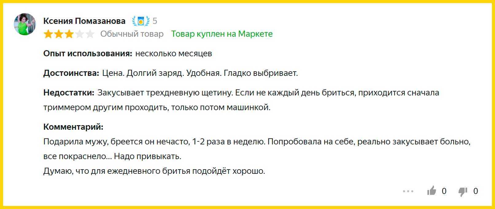 Отзыв №1: Машинка лёгкая, компактная, в руке сидит удобно, жужжит не громко, 2-3 дневную щетину убирает легко, кожу не раздражает, снимает мягко. Рекомендую. Доставлено раньше раньшего срока. Триммер тоже чисто выбривает и нос, и окантовку.