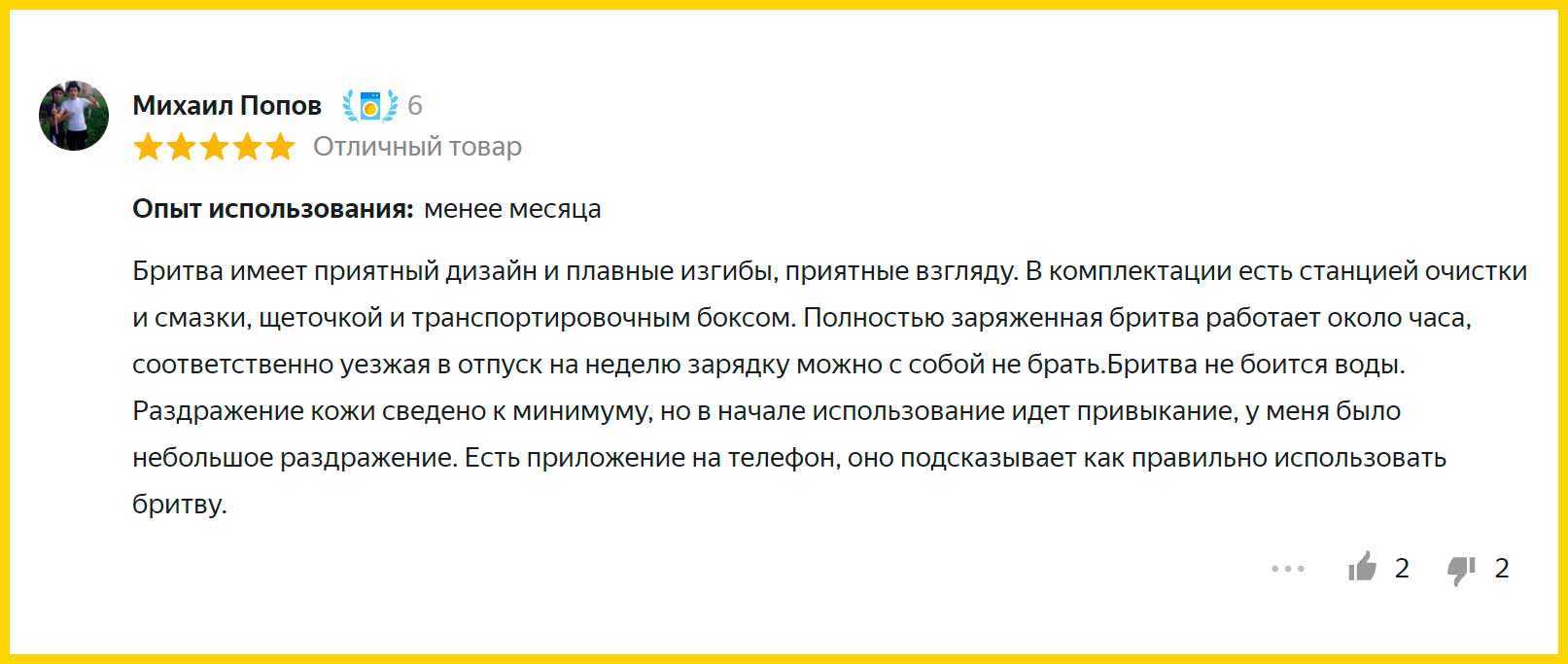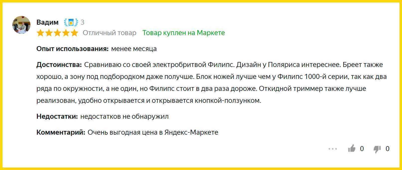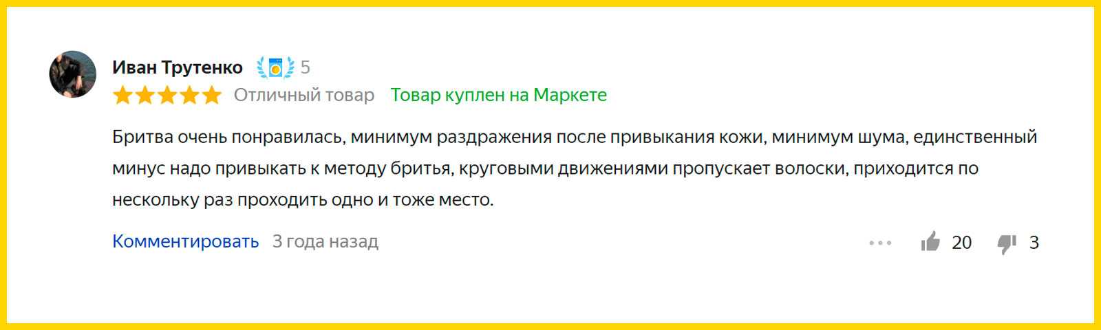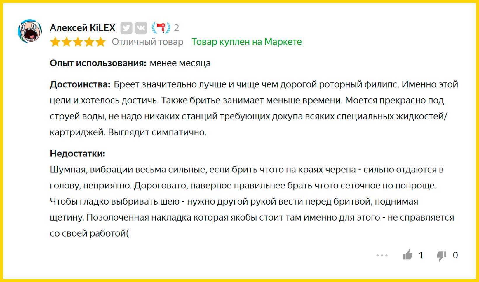 Отзыв №1: Машинка лёгкая, компактная, в руке сидит удобно, жужжит не громко, 2-3 дневную щетину убирает легко, кожу не раздражает, снимает мягко. Рекомендую. Доставлено раньше раньшего срока. Триммер тоже чисто выбривает и нос, и окантовку.