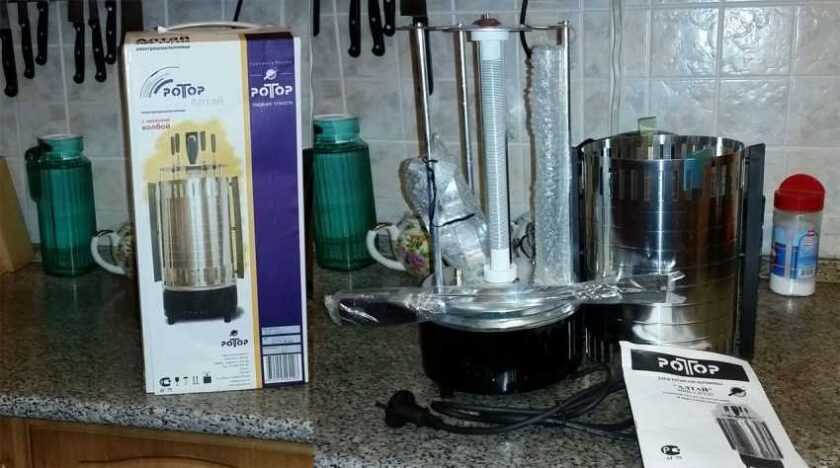 Для более качественного приготовления пищи и более равномерного прогрева вся эта конструкция с помощью электродвигателя вращается вокруг своей оси. Если в конструкции не предусмотрено автоматическое вращение шампуров, то их можно поворачивать вручную.