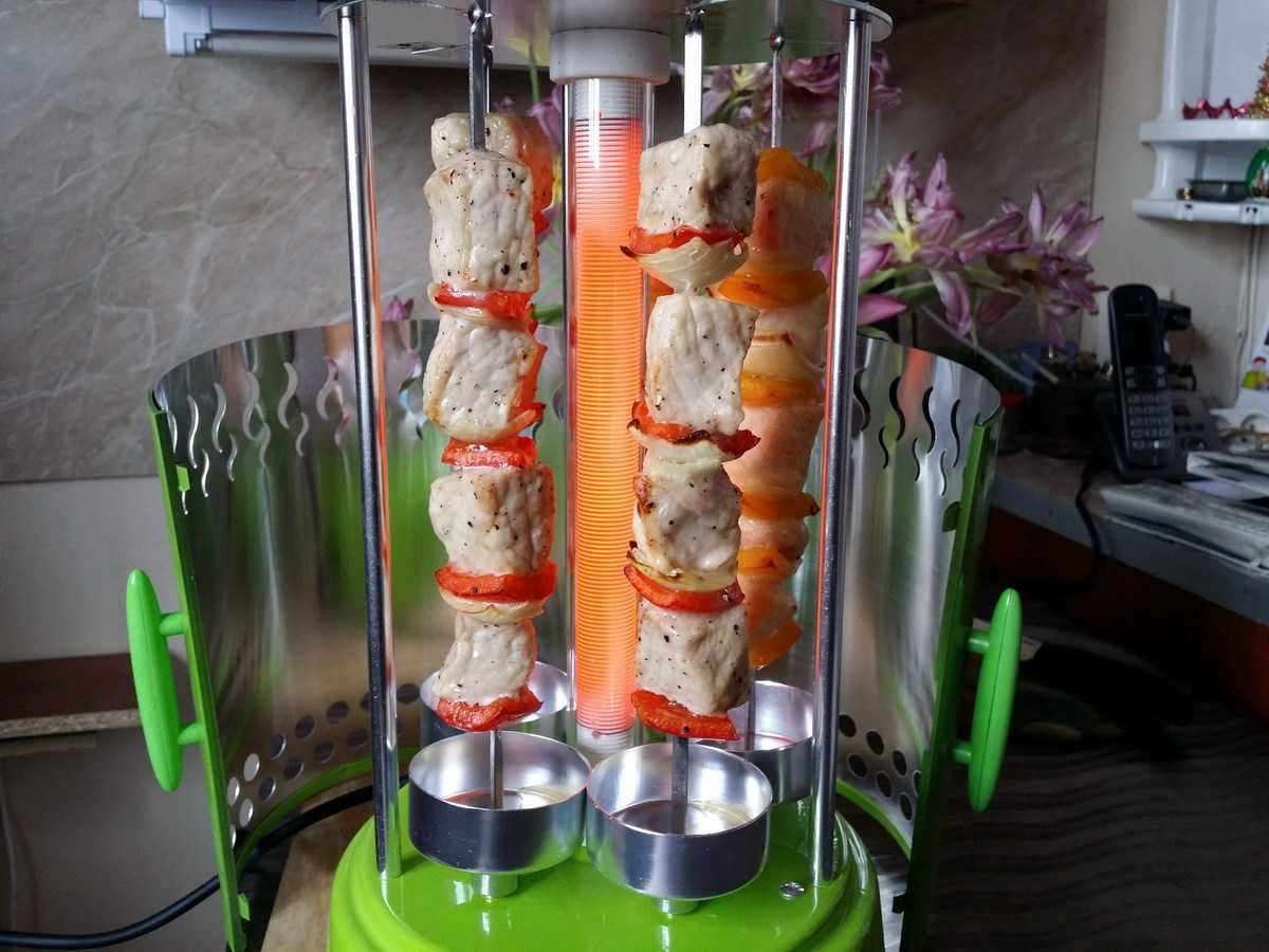 Отзыв покупателя: Удобная и компактная шашлычница. Шампуры вращаются автоматически, мясо готовится за 20 минут. Загрузить можно до 900 граммов. Мы готовили в шашлычнице овощи, сосиски, шашлык из баранины, свинины, курицы, рыбы. Есть кнопка включения-отключения. Единственный минус – кусочки должны быть маленькими, иначе не помещаются.