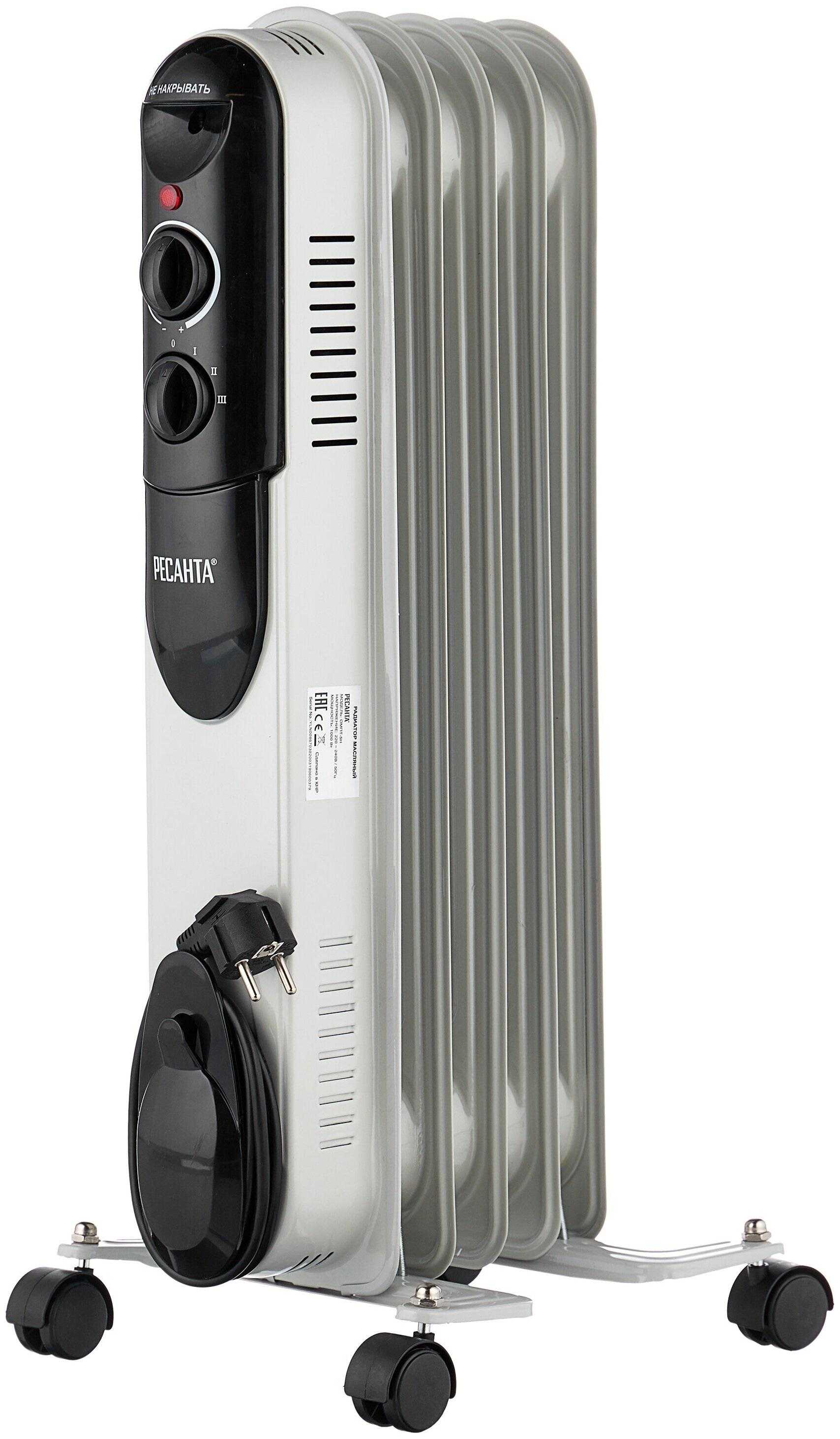 Пятисекционный масляный радиатор «Ресанта ОМПТ-5Н» разработан для обогрева небольших помещений – площадью до 10 кв. м в холодное время года. Его мощность составляет 1000 Вт, что обусловливает быстрый и эффективный нагрев воздуха. Модель устанавливается на полу и при необходимости может перемещаться по комнате при помощи 4-х колес.