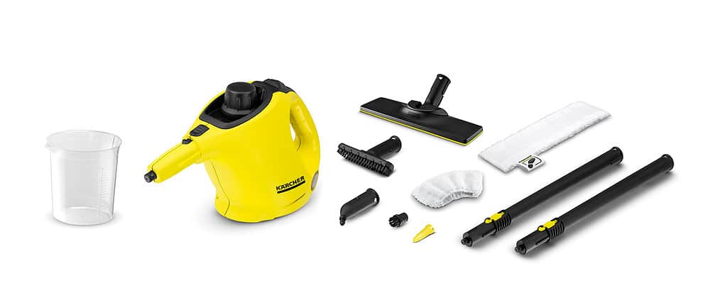 KARCHER SC 1 – продукт именитого бренда обойдется в 4 300 рублей. Его параметры: мощность – 1200 Вт, напор – 3 бара, период подготовки – 3 минуты, максимальная температура – 140 градусов Цельсия. Имеется резервуар вместимостью 0,2 л: достаточно для выброса пара в течение 10-15 минут. Вместе с оборудованием поставляются съемные приспособления, которые позволяют справиться практически с любыми задачами.