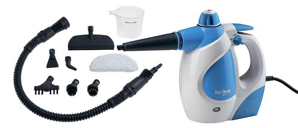 Главное преимущество этого пароочистителя – двойной отсек для жидкости: 300 мл для воды и 150 мл для моющего или химического средства. Кроме того, прибор работает в режиме сухого пара. Для ручного домашнего пароочистителя нетипично, но у DIRT DEVIL длинный шнур (5 метров) и в комплектации приложен гибкий шланг. Всего в наборе 8 насадок для разных поверхностей и труднодоступных мест.