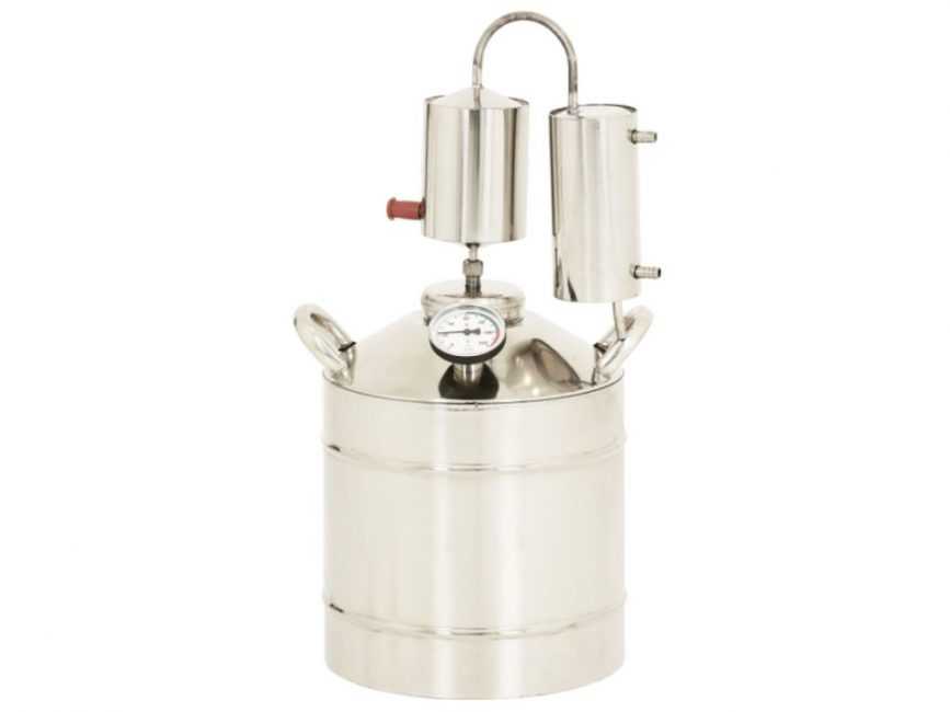Перегонный куб на 20 л имеет толщину стенок из пищевой зеркальной нержавеющей стали 2 мм и широкую заливную горловину диаметром 12 мм. В конструкции реализован клапан сброса давления на 1,5 атм. для обеспечения высокого уровня безопасности.