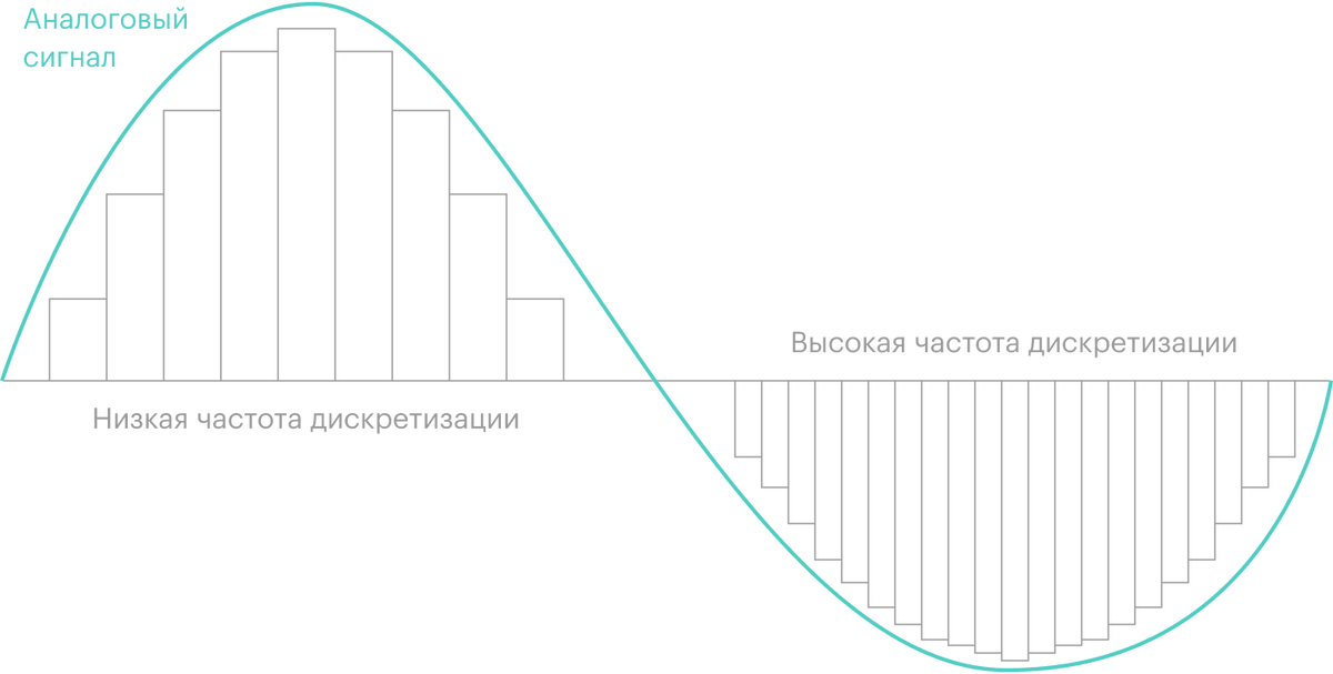 Зеленым цветом выделен аналоговый сигнал. Он непрерывный, но при оцифровке разбивается на части. Слева показана оцифровка с низкой частотой дискретизации: замеров мало, поэтому часть информации теряется. Справа замеры происходят чаще, поэтому удается получить больше данных