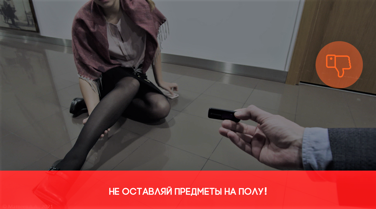 Решаем не трогать флешку, так как она чужая, и идём дальше. Мимо проходит девушка-коллега, и вдруг мы слышим её крик за своей спиной. Она упала, поскользнувшись об оставленную нами флешку, и подвернула ногу. Выбор был сделан ошибочно, закадровый голос сообщает: «Упавшие предметы на полу — это угроза для вас и для ваших коллег, так что выбирайте другой вариант».