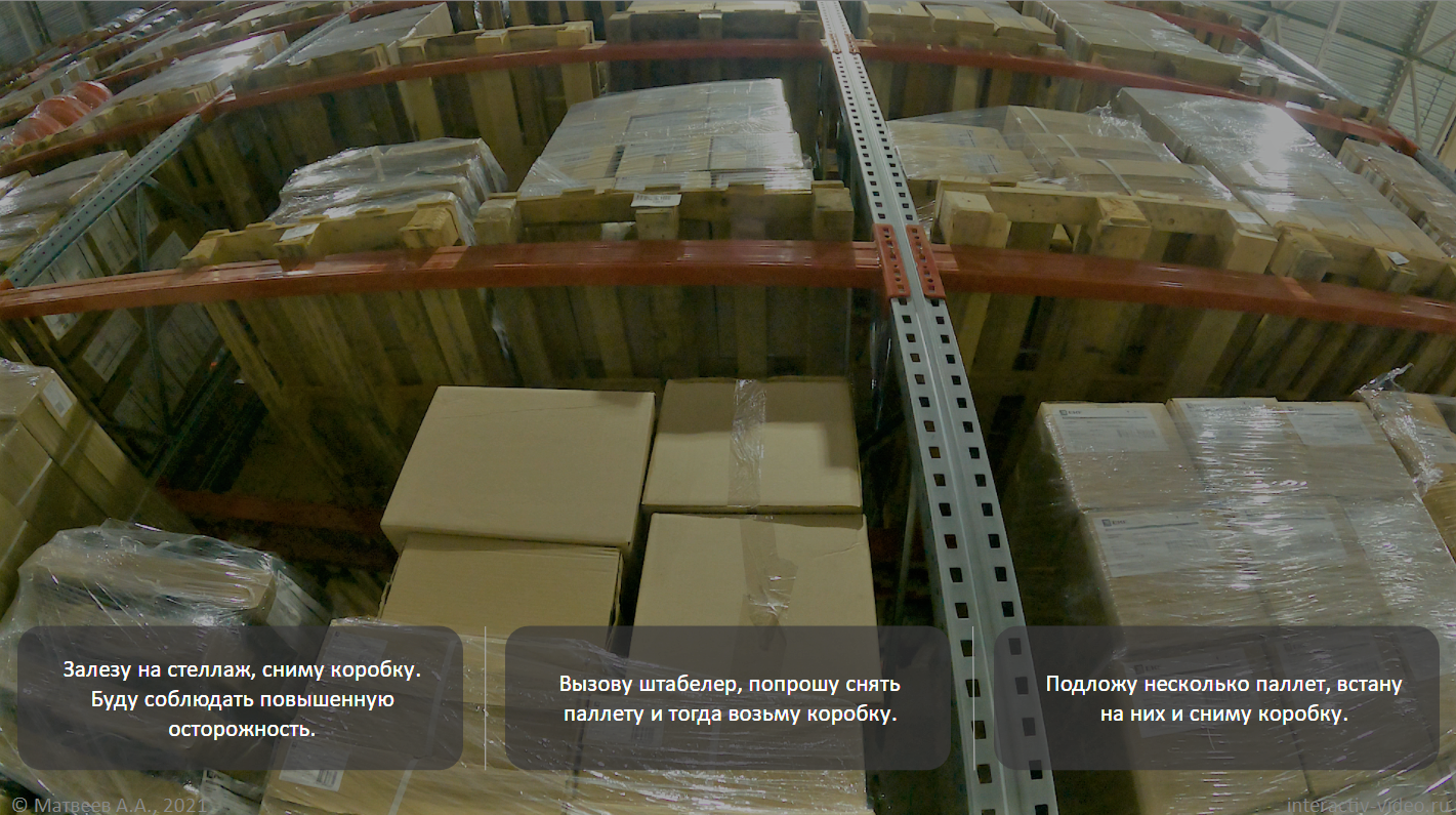На стеллажи и паллеты забираться запрещено. Выбираем вариант с вызовом штабелёра, и он оказывается верным.