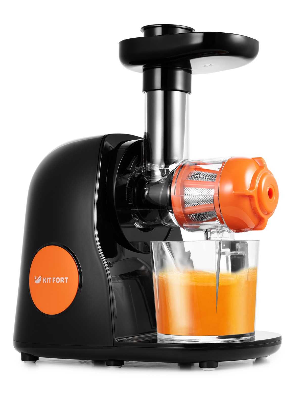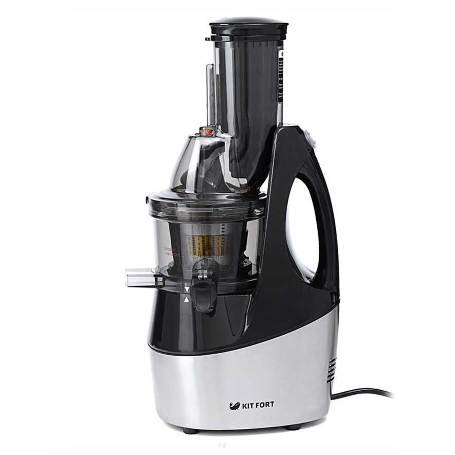 Отличная вертикальная шнековая соковыжималка от Kitfort почти в два раза дороже упомянутого ранее прибора от того же бренда. Чем же обусловлена такая разница в цене? Kitfort KT-1104 создана из более качественных материалов: нержавеющей стали, ударопрочного пластика. При этом сложный внутренний механизм управляется одной кнопкой, что довольно удобно, ведь устройство освоит даже неопытный пользователь. Предоставляется выбор между двумя цветами — металлическим и черным. Вне зависимости от тона, это устройство сможет успешно создавать качественные соки и смузи.