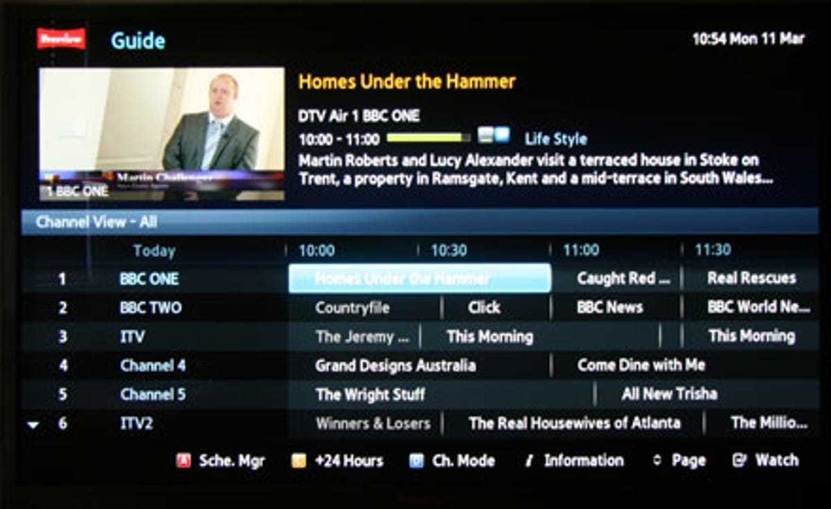 This model’s programming guide is very impressive too. It’s got pretty much everything you’d want from a guide, including a video window at the top so you can carry on watching a programme while checking the EPG to see what’s on later in the evening. The programming information is simply laid out across a landscape grid and the text is crisp and easy to read from a distance.
