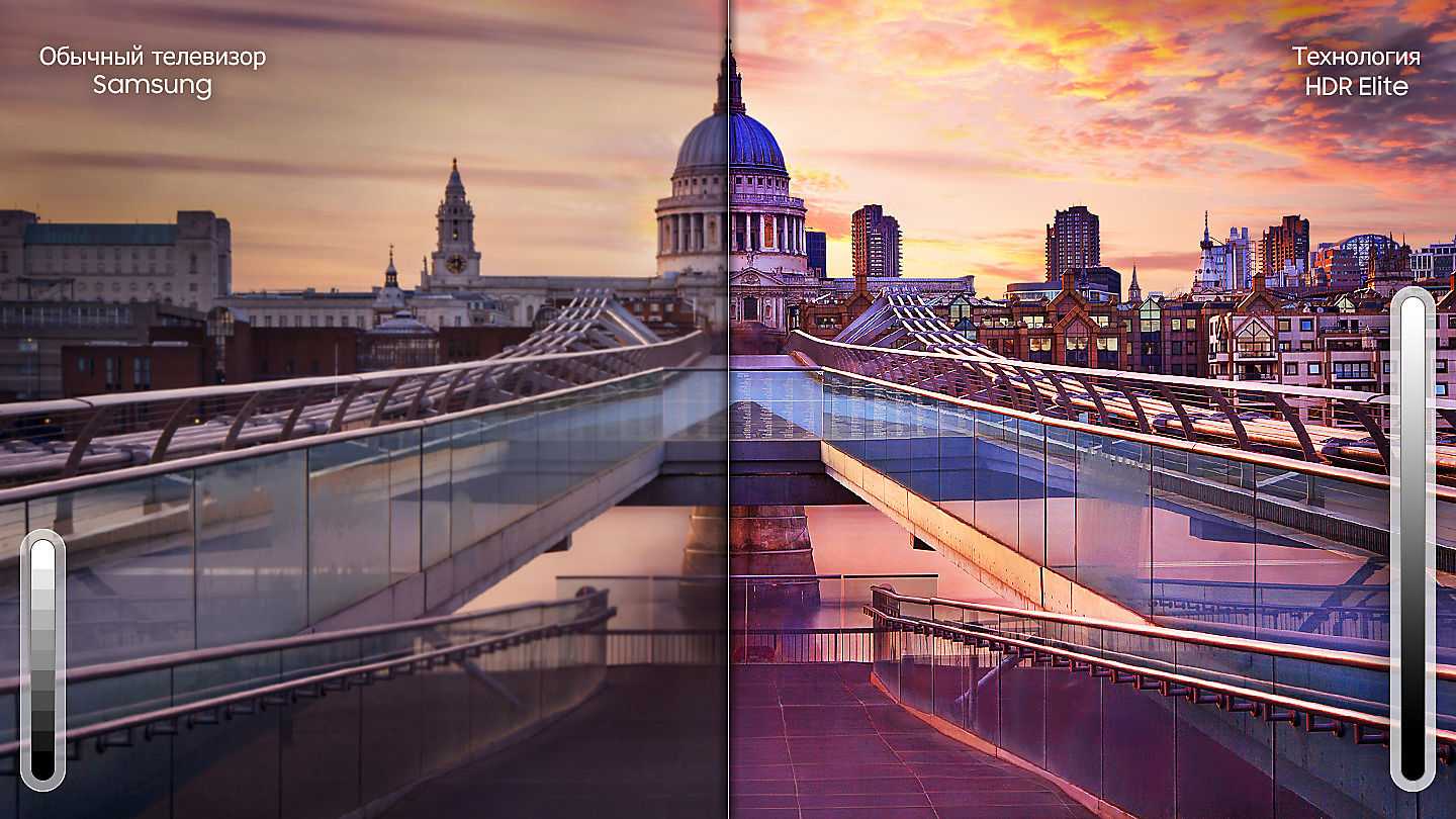Технологий, отвечающих за повышение качества картинки, становится все больше и больше. И одной из самых главных, способных увеличить уровень яркости многократно, является функция HDR. Она дает возможность видеть наш мир в расширенном динамическом диапазоне, в котором уровень яркости не только увеличивается, но и подвергается балансу. Контраст ярких и темных деталей картины настраивается так, что одновременно хорошо отображаются все ее элементы. Без HDR темный фон, наоборот, становился бы более темным, а светлый одновременно с этим более светлым. В итоге реалистичность и читаемость изображения сошли бы на нет. Модель от Samsung может поддерживать и формат HDR 10. Он работает еще и с цветом, что повышает реалистичность каждого кадра.
